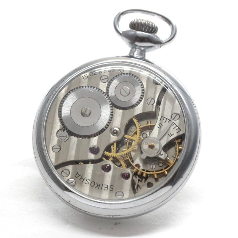 年代物である19セイコーの裏蓋をシースルーバック仕様へとカスタムした懐中時計です。コート・ド・ジュネーブ仕上げの美しいムーブメントを見える状態にし、使用したいただきたいという思いから、正美堂時計店で組み立てたカスタマイズウォッチとなります。