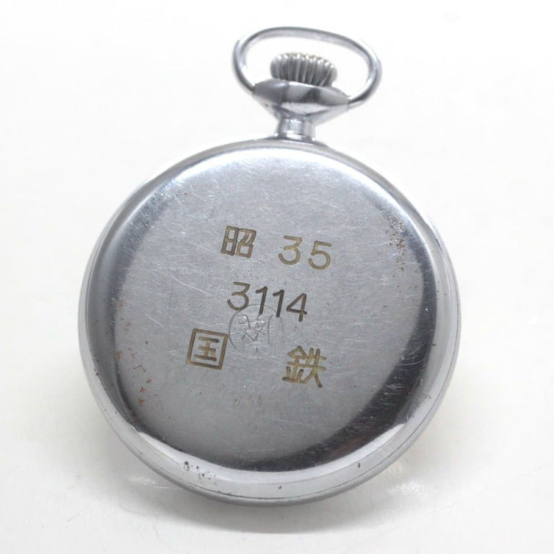 おすすめコメント:すでに絶版の懐中時計で、もう新品では手に入らない、とても希少な時計です。国鉄時代の職員が使用し、正確さが世界トップレベルの日本の鉄道史に欠かせない存在の19セイコー。15石で秒針止め機能がついているので、ハイスペックな時計です。状態のいい19SEIKOは年々手に入りにくくなってきており、オーバーホールも完了している、まだまだ使える時計です。 裏面の刻印は「昭35 3114 国鉄」となります。昭和35年から外装のケースが38年に変更されるまで、わずか3年の間に生産された楕円環の15石仕様と数少ないタイプとなります。希少な初期型モデルです。正しく廃棄された証である「廃」マークの刻印が入ってます。