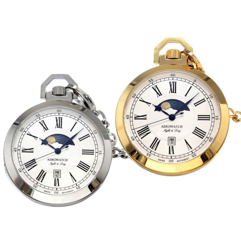太陽と月が入れ替わる文字盤が面白い、アエロのペア懐中時計。